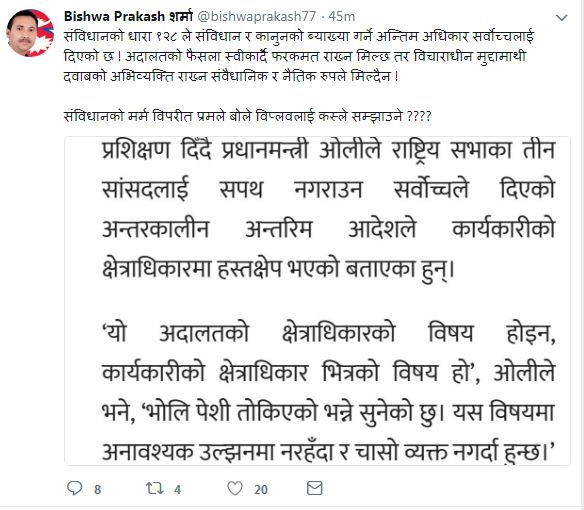 उनले भनेका छन्, ‘संविधानको धारा १२८ ले संविधान र कानुनको ब्याख्या गर्ने अन्तिम अधिकार सर्वोच्चलाई दिएको छ ! अदालतको फैसला स्वीकार्दै फरकमत राख्न मिल्छ तर विचाराधीन मुद्दामाथी दवाबको अभिव्यक्ति राख्न संवैधानिक र नैतिक रुपले मिल्दैन !संविधानको मर्म विपरीत प्रमले बोले विप्लवलाई कस्ले सम्झाउने ???’