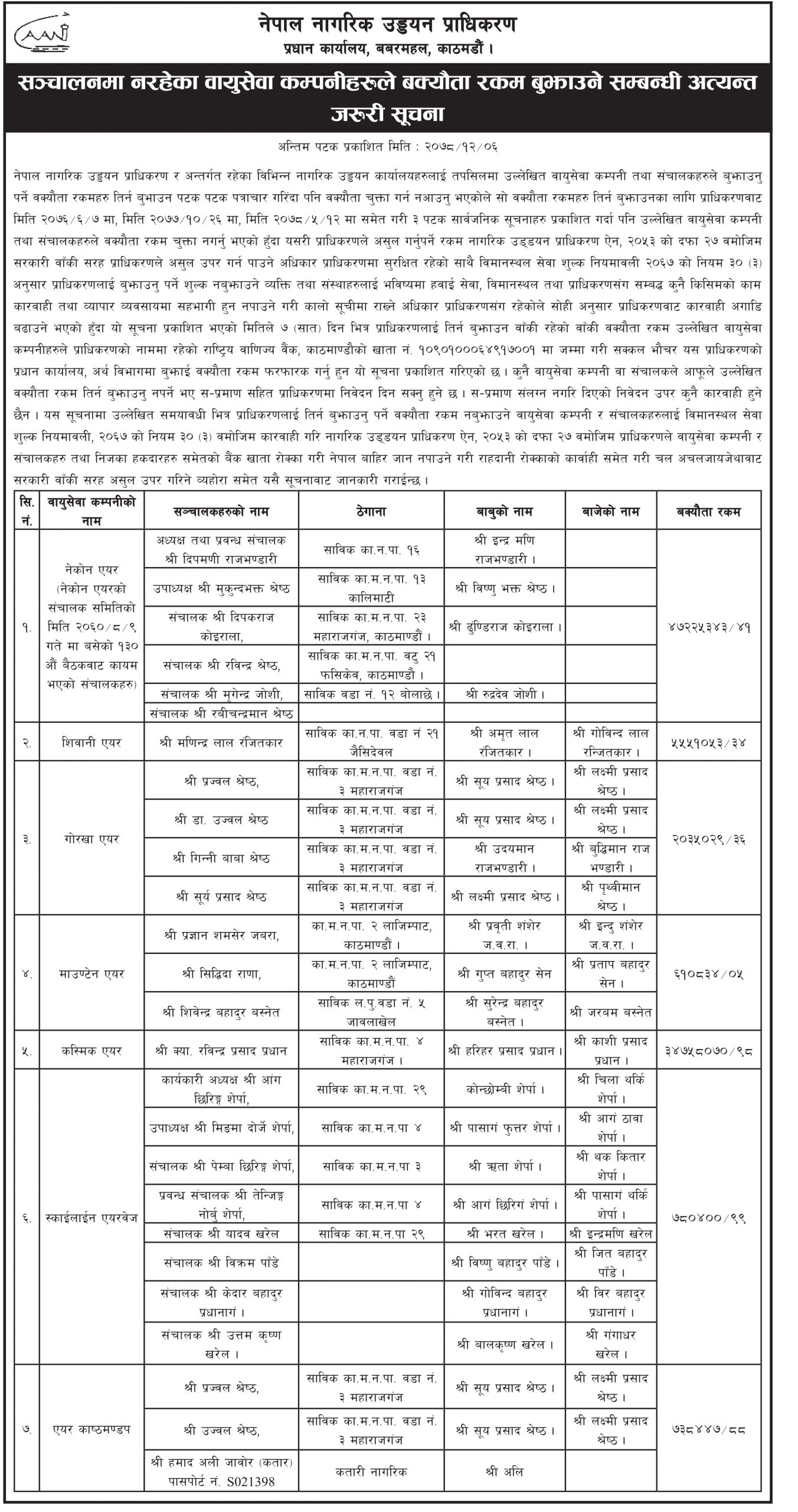 तीन पटक पत्राचार गर्दा पनि बक्यौता तिर्न नआएपछि प्राधिकरणले नेकोन एयर, शिवानी एयर, गोरखा एयर, माउण्टेन एयर, कस्मिक एयर, स्काईलाईन एयरवेज र एयर काष्ठमण्डपलाई कालोसूचीमा राखेर कारबाही गर्ने चेतावनी दिएको छ ।