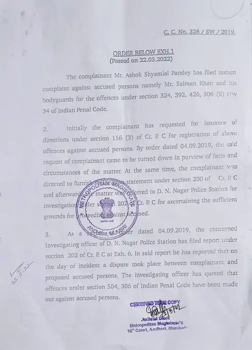 मुम्बईको अंधेरी मजिस्ट्रेट कोर्टले सलमान खान र उनका बडिगार्डलाई अप्रिल महिनाको ५ तारिखमा अदालत पेश हुन आदेश दिएको छ ।
