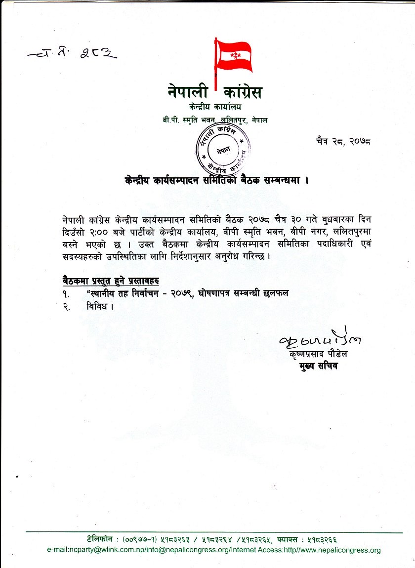 काठमाडौं । सत्तारुढ दल नेपाली काँग्रेसले केन्द्रीय कार्यसम्पादन समितिको बैठक बोलाएको छ । बैठक चैत ३० गते पार्टी कार्यालयमा बस्नेगरी बोलाइएको मुख्य सचिव कृष्ण प्रसाद पौडेलले जानकारी दिए ।