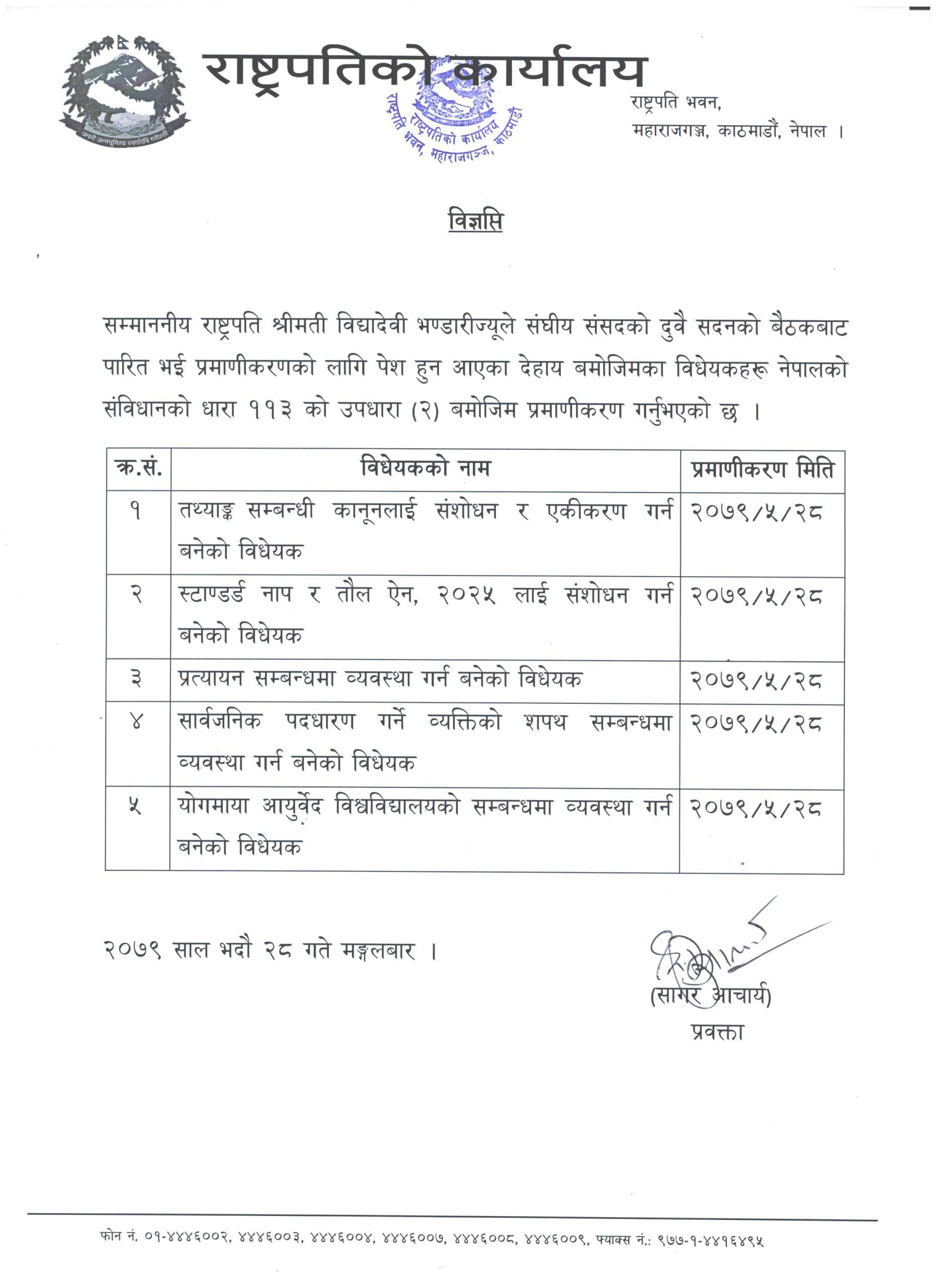 राष्ट्रपति भण्डारीले मंगलबार सार्वजनिक पदधारण गर्ने व्यक्तिको शपथ सम्बन्धमा व्यवस्था गर्न बनेको विधेयक, स्टाण्डर्ड नाम र तौल ऐन, २०२५ लाई संशोधन गर्न बनेको विधेयक, प्रत्यायन सम्बन्धमा व्यवस्था गर्न बनेको विधेयक र योगमाया आयुर्वेद विश्वविद्यालयको सम्बन्धमा व्यवस्था गर्न बनेको विधेयक प्रमाणीकरण गरेकी हुन् ।