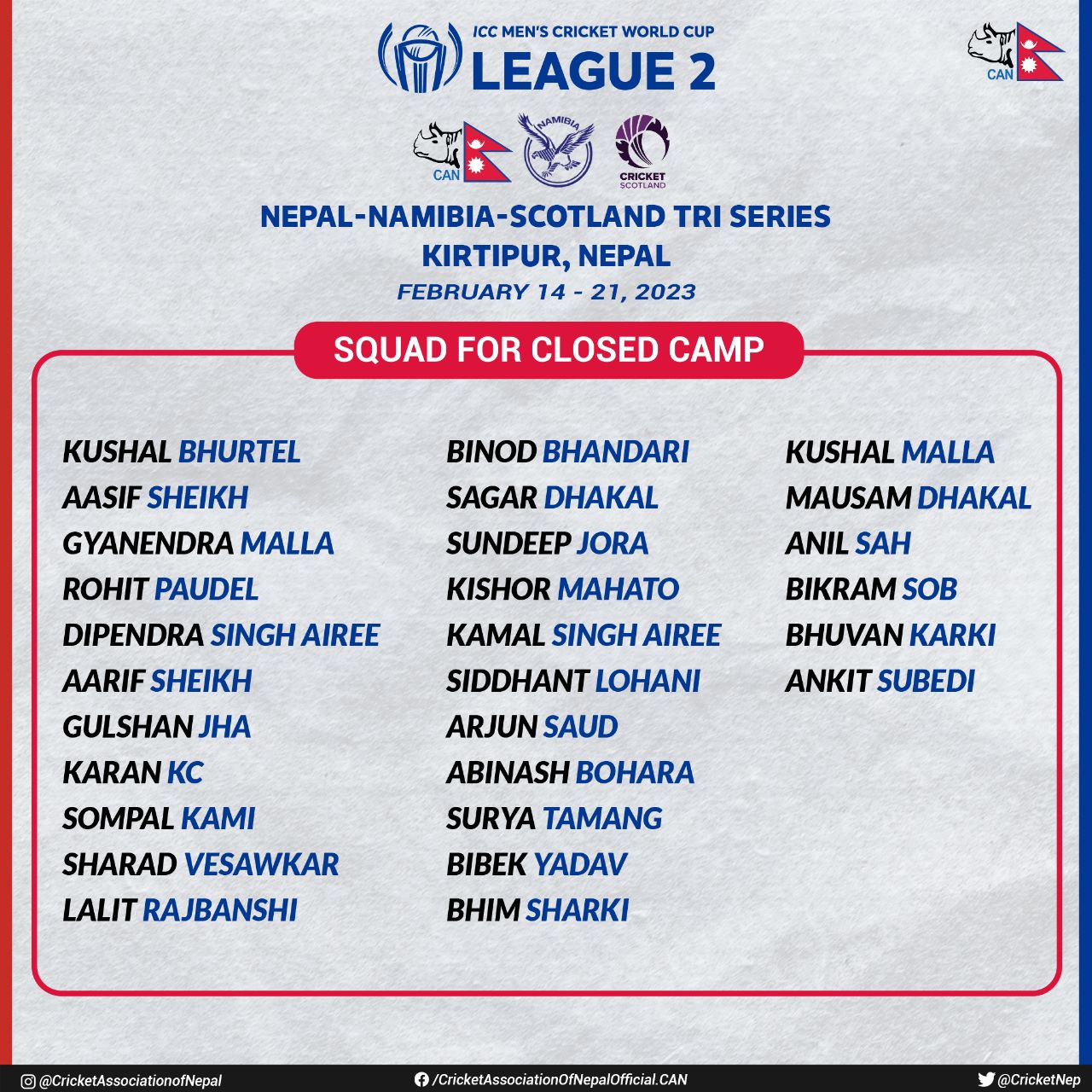 क्यानले सामाजिक सञ्जालमार्फत खेलाडीको सूची सार्वजनिक गरेको हो । कप्तान रोहित पौडेल तथा पूर्वकप्तान ज्ञानेन्द्रसहित सिद्धान्त लोहनी, सूर्य तामाङ तथा अंकित सुवेदी लगायतलाई समेटेर २८ सदस्यीय टिम बोलाइएको हो ।