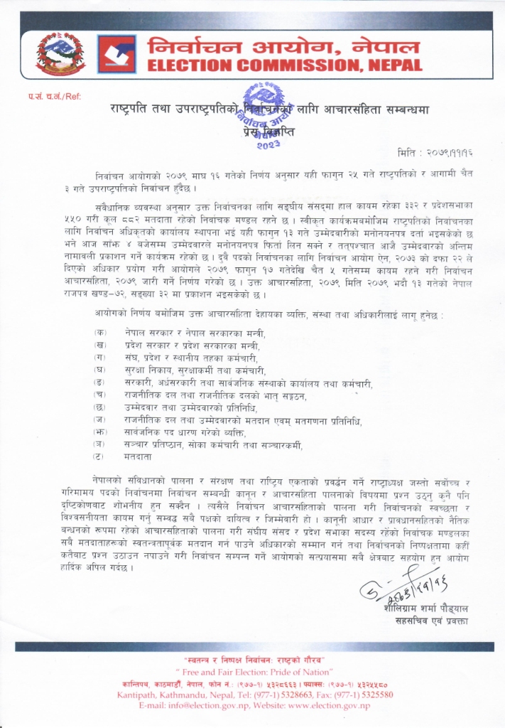 राष्ट्रपति तथा उपराष्ट्रपति निर्वाचनका लागि फागुन १७ गतेदेखि आचारसंहिता लागू हुने