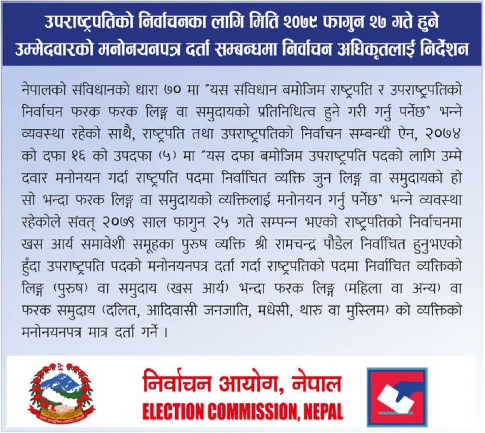 निर्वाचन अधिकृतलाई दिइएको निर्देशनमा राष्ट्रपति पदमा खस आर्य समावेशी समूहका पुरुष रामचन्द्र पौडेल निर्वाचित हुनुभएको उल्लेख गर्दै उपराष्ट्रपतिमा फरक लिङ्ग वा समुदायभन्दा फरक व्यक्ति हुनुपर्ने आयोगका प्रवक्ता शालिग्राम शर्मा पौड्यालले जारी गरेको विज्ञप्तिमा उल्लेख छ ।