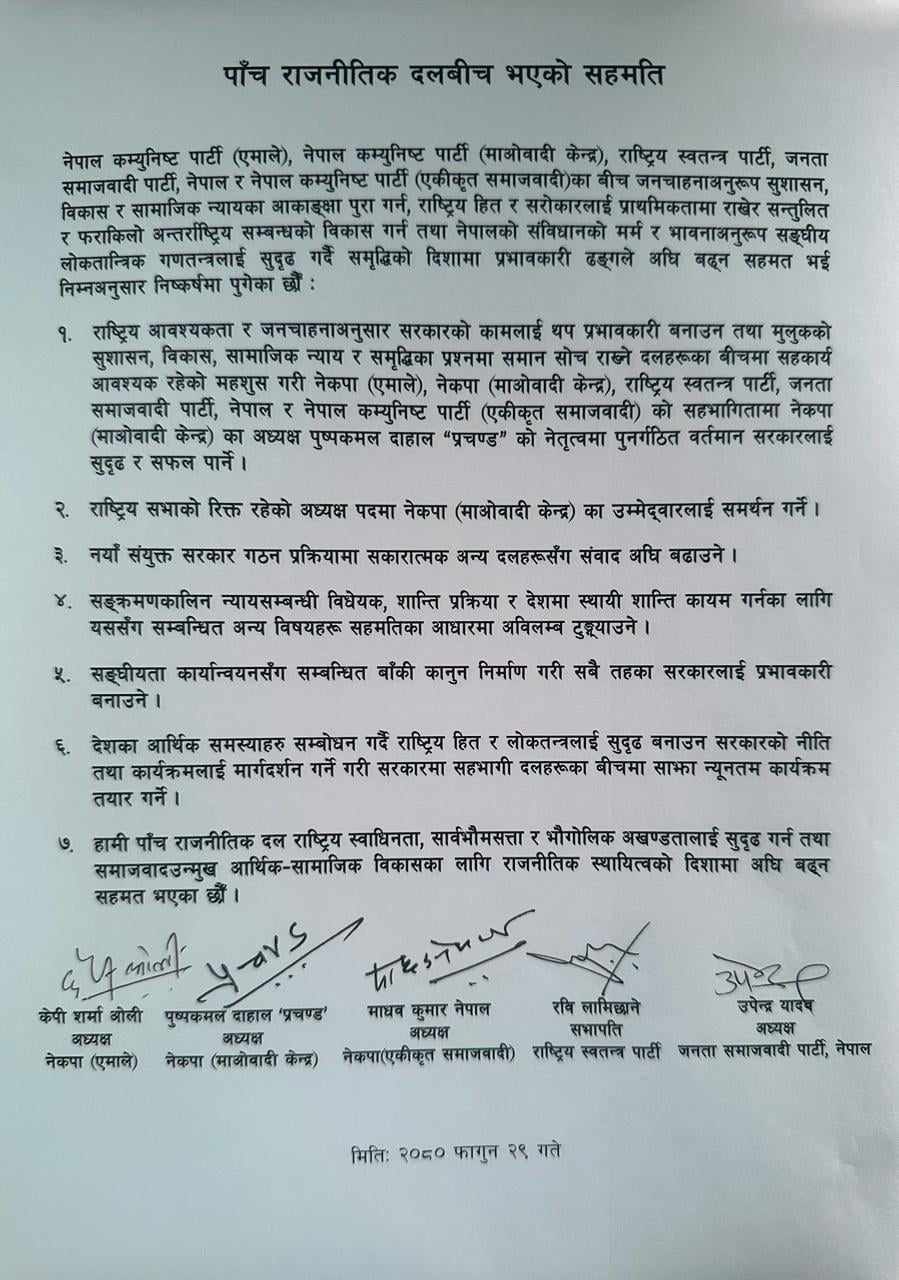 यस्तो छ सत्ता गठबन्धनका पाँच दलबीच भएको ७ बुँदे सहमति