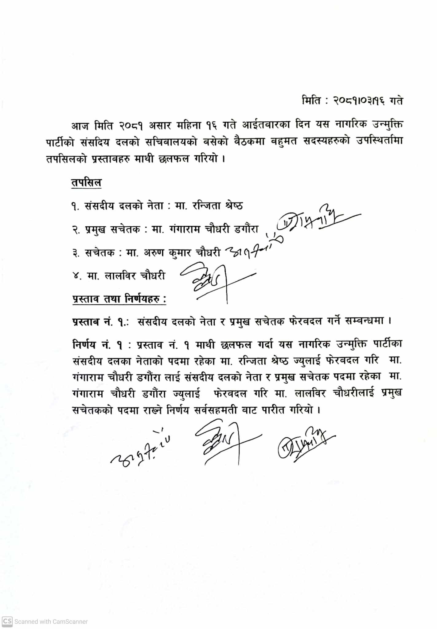 श्रेष्ठलाई हटाएर गंगाराम चौधरी डगौरालाई संसदीय दलको नेता चयन गरिएको छ । यस्तै प्रमुख सचेतक रहेका डगौराको स्थानमा लालवीर चौधरीलाई प्रमुख सचेतकको पदमा राख्ने निर्णय सर्वसम्मतिबाट पारित गरिएको छ । दलको नेता चयनसम्बन्धी पत्र आज संसद् सचिवालयमा दर्ता गर्ने बताइएको छ ।