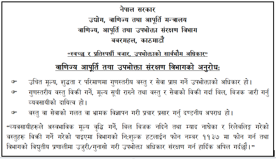 वाणिज्य आपूर्ति तथा उपभोक्ता संरक्षण विभागको अत्यन्त जरुरी सूचना