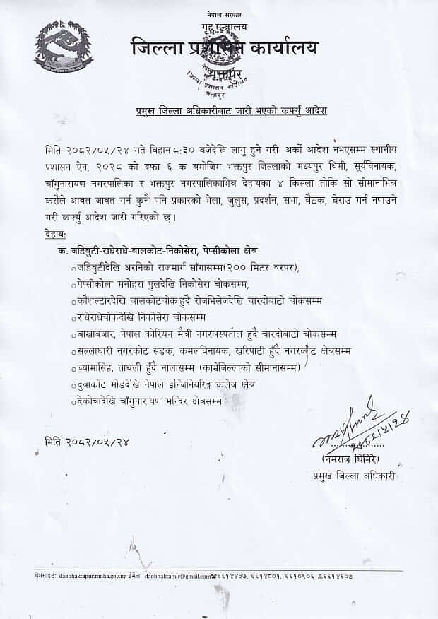 कर्फ्यु आदेश जारी गरेको प्रमुख जिल्ला अधिकारी नमराज घिमिरेले जारी गरेको आदेशमा उल्लेख छ । जडिबुटीदेखि चाँगुनारायणसम्म कर्फ्यु आदेश जारी भएको छ ।