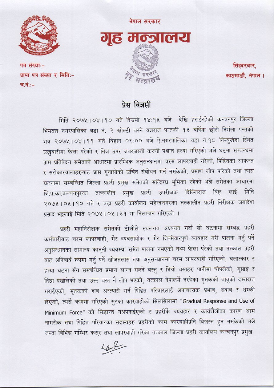 साउन १० गते साथीको घरमा गएकी कञ्चनपुरकी १३ वर्षीया बालिका पन्तको बलात्कारपछि हत्या भएको थियो । सो घटनामा कञ्चनपुरका तत्कालिन प्रहरी प्रमुख विष्ट र वडा प्रहरी कार्यालय महेन्द्रनगरका प्रमुख भट्टले अनुसन्धानमा लापरवाही गरेको भेटिएको थियो । सरकारी छानबिन समितिले प्रहरी लापरवाही भएको रिपोर्ट दिएपछि विष्ट र भट्टलाई स्पष्टीकरण सोधिएको थियो ।