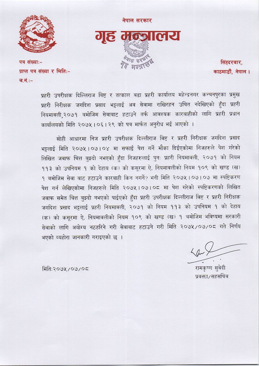 प्रवक्ता रामकृष्ण सुवेदीले विज्ञप्ती जारी गरेर गृह मन्त्रालयले सोधेको स्पष्टिकरणमा चित्त बुझ्दो जवाफ नआएपछि बर्खास्त गरिएको जानकारी दिनुभएको छ । द्धय प्रहरी अधिकारीलाई प्रहरी नियमावली २०७१ को नियम ११३ को उपनियम १ को देहाय (क)को कसुरमा नियमावलीको नियम १०९ को खण्ड (ख) १ बमोजिम बर्खास्त गरेको जनाइएको छ ।